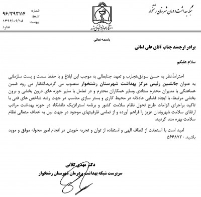 اخبار مصطفی حسین زاده اخبار 16 شهریور 1396 بازدید: 606 امتیاز: ( 0 Rating ) انتصاب آقای علی امانی به عنوان جانشین رئیس مرکز بهداشت شهرستان رشتخوار امتیاز کاربران لطفا رای دهید رای 1 رای 2 رای 3 رای 4 رای 5 قبلی بعدی