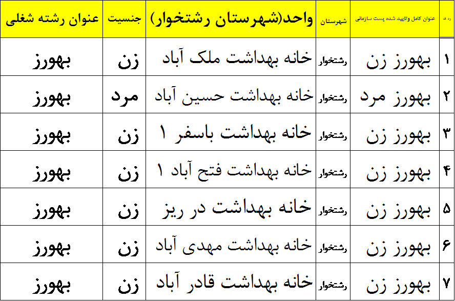 دانشگاه علوم پزشکی مشهد جهت خانه های بهداشت مورد نیاز خود (درریز، قادرآباد، مهدی آباد، باسفر، ملک آباد، فتح آباد و حسین آباد) در نظر دارد افراد واجد شرایط در شغل بهورز را با شرایط بومی گزینی از طریق فراخوان شناسایی و از طریق آزمون کتبی در حیطه های عمومی و مصاحبه شغلی پس از احراز صلاحیت عمومی بر اساس قانون گزینش و گذراندن دوره آموزشی به صورت پیمانی و یا قرارداد انجام کار معین با شرایط و ضوابط مندرج در این آگهی دعوت به همکاری نماید متقاضیان محترم می توانند از روز چهارشنبه مورخ 1399/10/10 لغایت سه شنبه مورخ 1399/10/23 به آدرس ذیل مراجعه و نسبت به کسب اطلاعات تکمیلی و در صورت تمایل ثبت نام اقدام نمایند