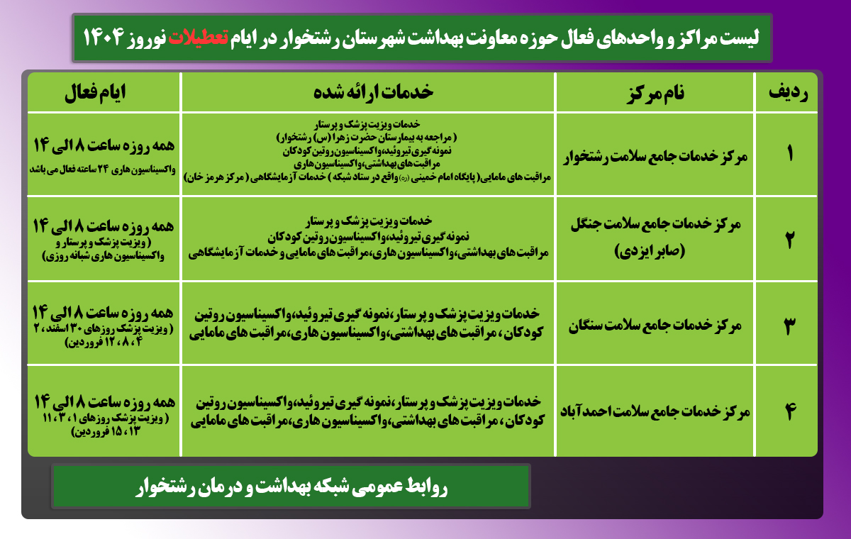 لیست مراکز بهداشتی و درمانی فعال و آماده خدمات دهی به همشهریان و مسافران عزیز شهرستان رشتخوار در ایام نوروز